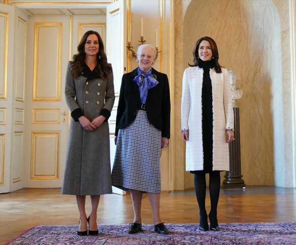 After her stop by a woodsy kindergarten this morning, the Duchess of Cambridge did a costume change for her big meeting at Christian IX’s Palace in Copenhagen. She was escorted into the palace by Crown Princess Mary, and they joined Queen Margrethe II inside. The three royal women posed together inside what I’m sure is a huge state room, but everything looked so empty and vast. Queen Margrethe looked very welcoming to Kate, and CP Mary looked… like she was tolerating CopyKeen.
