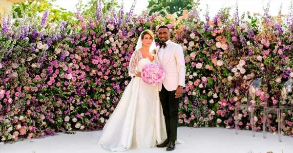 The couple went all out for their big day, splurging on everything from flamethrowers and a seven-tier cake, to an extravagant flower wall and Delphinium chandeliers.