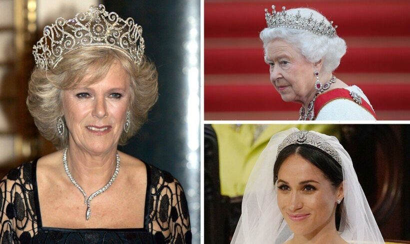 Queen Mary was famed for her love of jewellery, and she had a knack for creating stunning necklaces, show-stopping earrings and timeless tiaras. Several of the tiaras Mary commissioned are worn by the Queen today, while others have been worn by Camilla, Duchess of Cornwall and Meghan Markle, Duchess of Sussex in recent years. Express.co.uk takes a look at five of the most famous of Queen Mary’s tiaras.