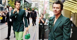 Harry Styles Pairs His Green Suit With a Floral Brooch and Matching Handbag