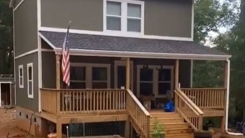 The dad said: “If you go to any Home Depot, at least in the southeast, you go inside of their parking lot, you’ll typically see sheds … this right here is actually a tiny home, Tuff shed from Home Depot, two stories, 860 square feet, one-bedroom, full kitchen, full living room, the porch, then of course we got a chicken coop back there … a deck with our above-ground pool and a trampoline for the little one, of course.”