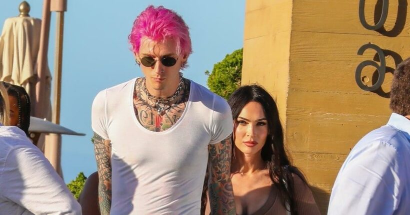 Ahead, see how Machine Gun Kelly completed this coordinated couple moment in an equally cool look consisting of a white T-shirt, pinstripe pants, chunky boots, a silver choker necklace, and tiny round, retro sunglasses, then shop Fox’s exact top, jeans, and heels.