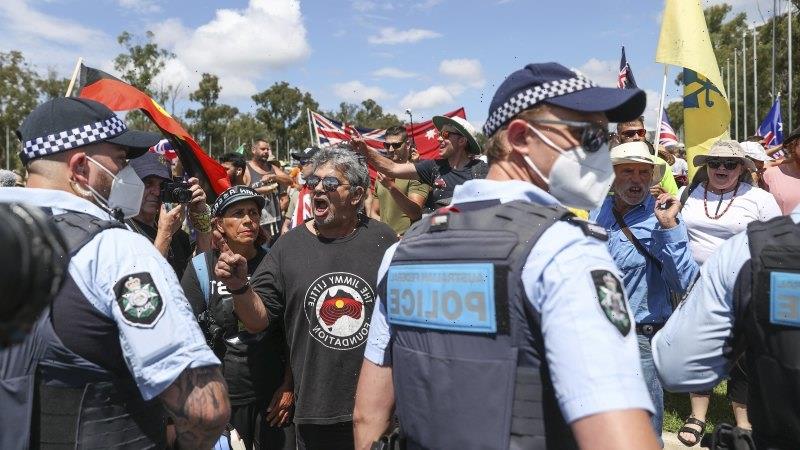 The confrontation comes weeks after protesters physically clashed with police at the entrance to Parliament House, an incident that followed a fire at the front of Old Parliament House, which resulted in a man being charged.