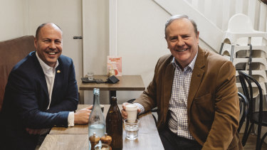 Josh Frydenberg (left) has enlisted Peter Costello, who ran surpluses for a decade, to take part in several promotional photo shoots at Melbourne coffee shops since becoming Treasurer.Credit:Tash Sorensen