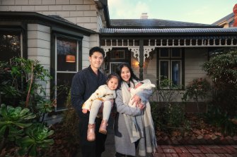 Sean and Jenny Huang and their children in front of their Armadale home which they hope to sell next Saturday.Credit:Luis Enrique Ascui