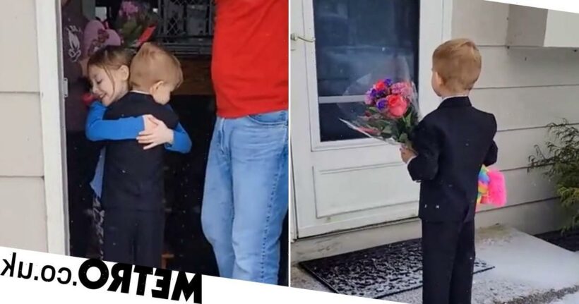 Dressed in a black suit and armed with flowers, chocolate and a rainbow unicorn, the little boy confidently walked up to his love interest’s front door.