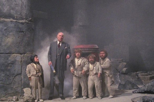 Malcolm Dixon, Mike Edmonds, Jack Purvis, David Rappaport, and Ralph Richardson in Terry Gilliam’s Time Bandits (1981).