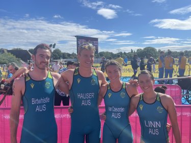 Birtwhistle was sixth after the swim and ride, but ran strongly to make up ground in his run to bring Australia into third place albeit 25 seconds behind England when he handed over to Natalie van Coeverden.