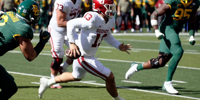 Oklahoma quarterback Caleb Williams (13) scrambles for positive yards against Baylor during the first half in Waco, Texas, Saturday, Nov. 13, 2021.
