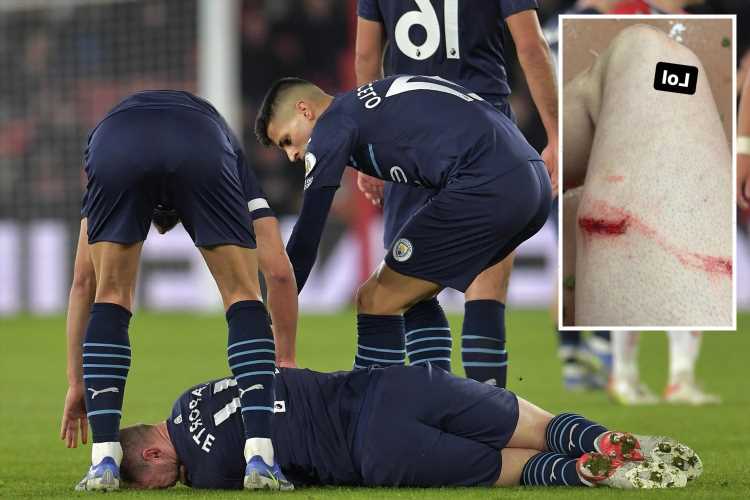 MANCHESTER CITY scorer Aymeric Laporte paraded his gruesome thigh injury after Stuart Armstrong escaped red for a studs-in challenge.