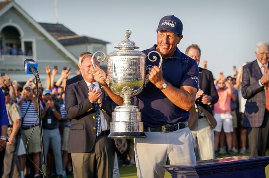 Phil Mickelson raises the Wanamaker Trophy after winning the PGA Championship. (Photo: David Yeazell, USA TODAY Sports)
