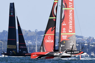 Italy’s Luna Rossa, left, races against Team New Zealand during race six.Credit:Photosport