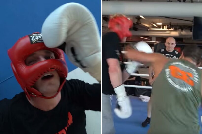 However a boxing sparring session appeared to take its toll on Paul as a right hook flattened him, causing trainers to run into the ring and help him back up.