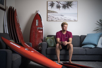 Surfer John John Florence in his loungeroom before the The World Surf League competition in Narrabeen.Credit:Louise Kennerley