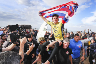 John John Florence celebrating after winning the 2016 World Surf League title.Credit:WSL