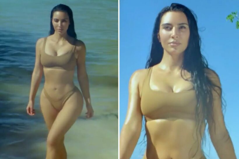 KIM Kardashian showed off her curves in a nude bikini from her SKIMS Swims line.