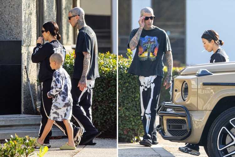 Kourtney and Travis, 45, appeared to be matching in sweatpants with the lower portion of a skeleton on them.