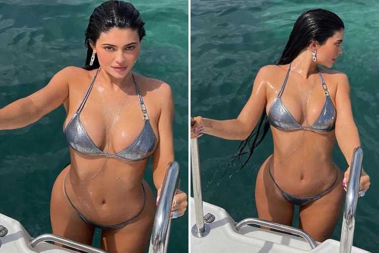 Kylie, 23, looked incredible in her iridescent silver suit as she posed boat-side overlooking crystal clear blue waters.