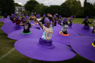 Members of the Mahogany carnival group rehearse for their upcoming performance at the Platinum Jubilee Pageant, at Queens Park Community School in north London.Credit:AP