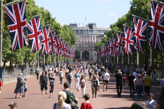 People walk along The Mall, decorated for the Platinum Jubilee.Credit:AP