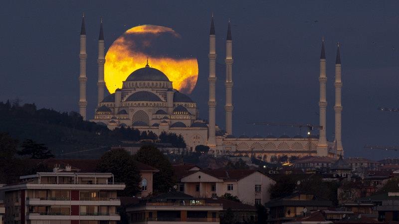 A full moon rises behind the Camlica mosque in Istanbul, Turkey. The city wants to host the 2026 round of climate talks.Credit:AP