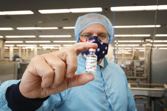 PM Scott Morrison visits CSL’s facility in Melbourne in February. The federal government has missed its vaccine rolllout targets.Credit:Getty
