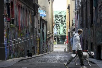 A man walks past Melbourne’s Hosier Lane during lockdown last August.Credit:Penny Stephens