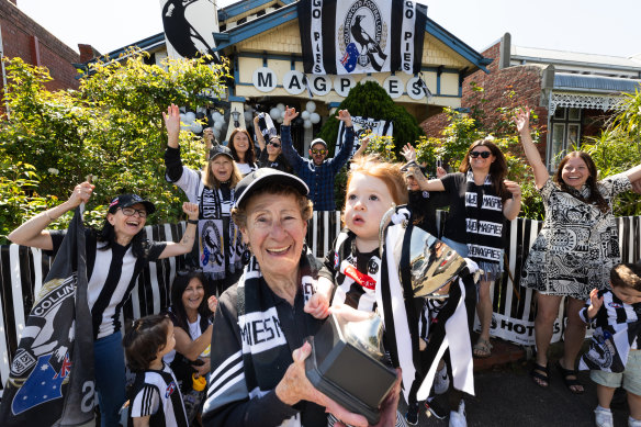 “We are not at the MCG for the grand final on Saturday because we couldn’t get tickets, but this is our way of helping out,” she says, gesturing to the decorations and Collingwood paraphernalia.