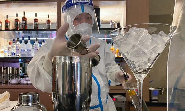 A bartender inside a hotel in Zhangjiakou – one of three cities hosting the winter Olympics – mixes cocktails while dressed in full PPE