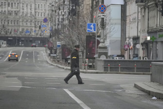 A man wearing the yellow armband of the civil defense crosses a deserted boulevard during an air raid alarm in Kyiv on March 1. Credit:AP