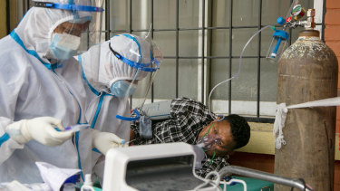 Nepalese paramedics treat a COVID-19 patient outside an emergency ward of a government run hospital in Kathmandu.Credit:AP