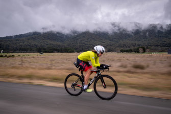 Powerhouse: ultra triathlete Rosie Spicer training in the Buckland Valley, where she once hit a wombat while riding her bike. Credit:Eddie Jim