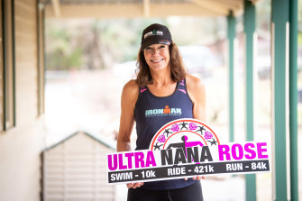 Ultra Nana Rose: Rose Spicer at her Porepunkah house with a sign made for her entry in the 2021 Noosa Ultraman in May.Credit:Eddie Jim
