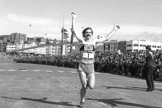 Robert De Castella crossing the finish line at the City to Surf.Credit:Staff photographer