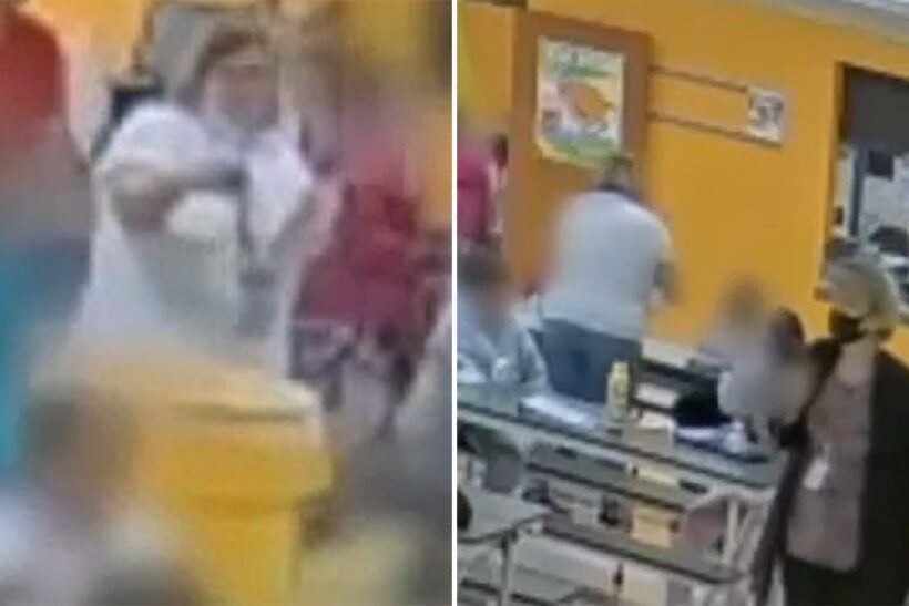 CCTV footage shows the young girl dumping an unwanted waffle into a rubbish bin before a dinner lady pulls it back out and wipes it down with a napkin.