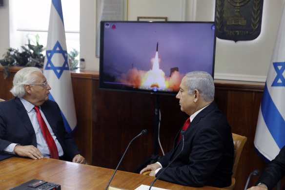 Israeli Prime Minister Benjamin Netanyahu, right, and then US ambassador to Israel David Friedman watch a video showing the launch of the Arrow 3 hypersonic anti-ballistic missile in Jerusalem in 2019.Credit: AP/File