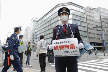 A security guard urges people not to watch a half-marathon in Sapporo in northern Japan on Wednesday to curb the spread of COVID-19.Credit:AP