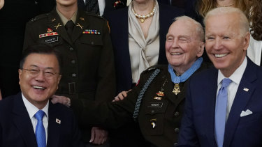 South Korean President Moon Jae-in and US President Joe Biden presenting a medal to a US veteran of the Korean War on the weekend.Credit:AP