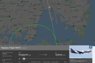 Flight tracking websites show FedEx flight FX9075 from Singapore was on its final approach to Sydney over Botany Bay at just 1950 ft (590 metres) shortly before 10.30pm and just a few kilometres from the runway.