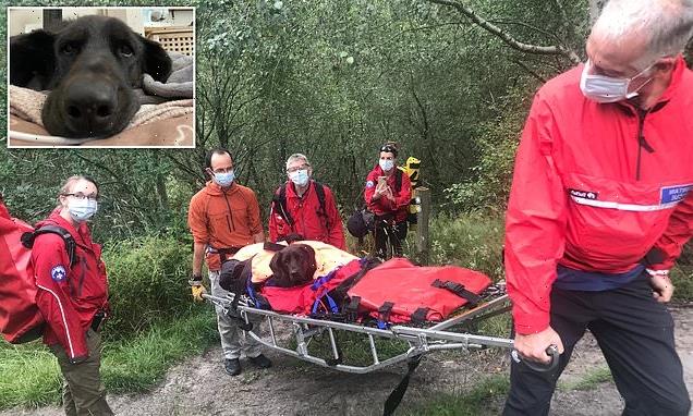Paw Patrol! Mountain rescue team STRETCHER Jess the brown Labrador safely down off hilly terrain, after stranded dog, 11, became ill on her afternoon walk and was too heavy for her owner to carry home