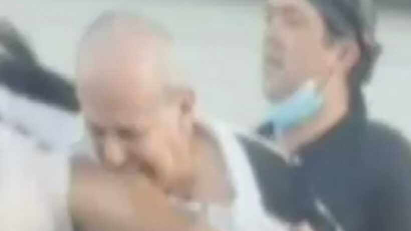 Video captured the bizarre scene as George Casha, 58, went at the other man with a broom and screamed "I'll f***ing kill you" in Queensland, Australia.