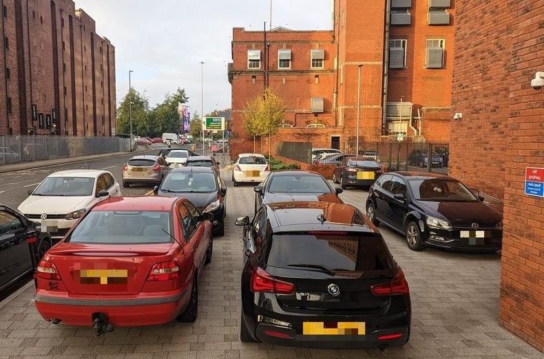 Motorists were heavily criticised after images shared on social media showed "at least 20 vehicles" on the pavement in Trafford Wharf Road in Manchester.