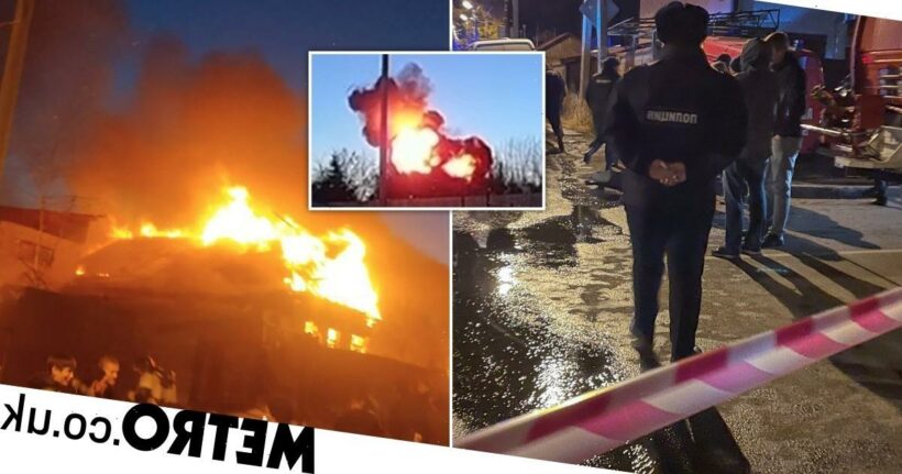 Russia’s Emergencies Ministry said the Su-30 fighter jet crashed during a training flight and fell on top of the wooden building, sparking a huge fire.