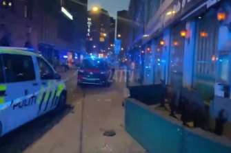 Police attend the site of a mass shooting at a gay nightclub in Oslo, Norway. Saturday marks the start of Pride Month in the city.Credit:Screengrab/247TV
