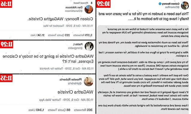 On October 9, 2019, shortly after Coleen accused Rebekah Vardy’s account of leaking information about her, Dan Atkinson, 39, and a father-of-two from Folkestone, Kent, tweeted: ‘Coleen Rooney: WAGagtha Christie’.