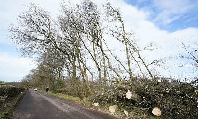 Fallen trees are seen on a road in the Little Hay area of Birmingham today after Storm Dudley hit many areas across the UK