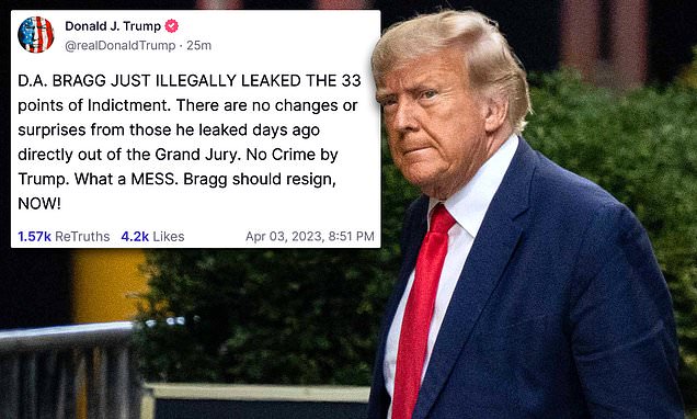 In a damning post, Trump wrote on Truth Social: ‘Wow! District Attorney Bragg just illegally LEAKED the various points, and complete information, on the pathetic Indictment against me. I know the reporter and so, unfortunately, does he.