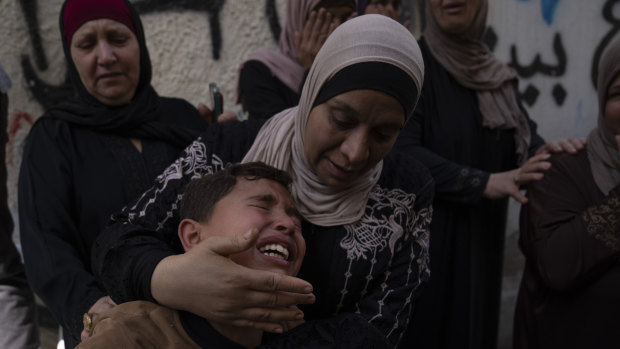 A boy cries while mourners take the last look at the body of Ramzi Zabarah, 35, at the family house, during his funeral in the West Bank near Nablus.Credit:AP