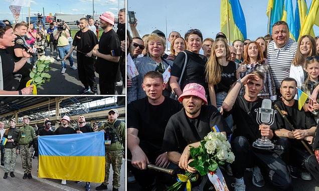 Ukraine’s Eurovision winners Kalush Orchestra return to a heroes’ welcome as they are mobbed by fans in Lviv… and then break into an impromptu version of their victorious song