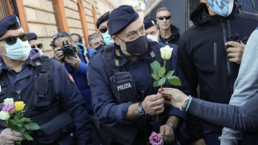 Demonstrators bring flowers to police officers at Rome’s Circus Maximus during a protest against a new anti COVID-19 measure.Credit:AP